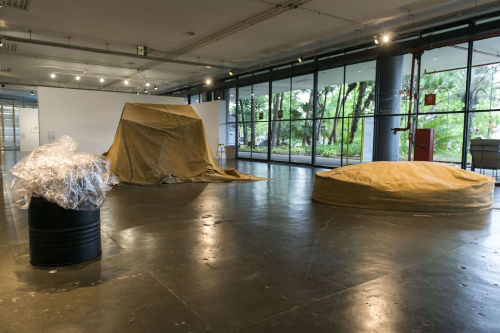 O conjunto de obras que Carmela Gross (1946, São Paulo, Brasil) apresentou na 10a Bienal em 1969, remetia a elementos urbanos recobertos ou ocultos, usualmente despercebidos pelos passantes. No contexto da escalada da censura e da violência de Estado promovidas pelo regime militar, uma grande lona cinza-esverdeada recobrindo uma estrutura metálica avultada (A CARGA, 1968) aparecia não apenas como uma escultura misteriosa, mas estava impregnada de sentidos de ameaça e perigo. PRESUNTO (1968) e BARRIL (1969), as outras obras que integravam esse conjunto, eram igualmente exercícios de anotação da paisagem urbana carregados de ambivalência entre opacidade e morbidez.