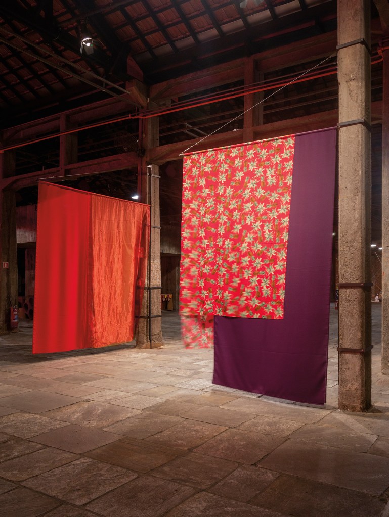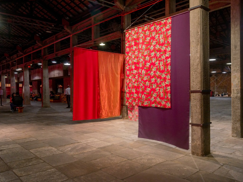 PIVOT FLAG can be seen as the gateway to this exhibition. It was assembled from many colorful fabrics, hung and layered over one another on a metal beam attached to one of the warehouse’s columns, right at the entrance. A mechanism of axes, joints, and bearings allows it to pivot. Like an improvised clothesline, it serves as a banner, a flag — or perhaps a circus curtain! [CG]