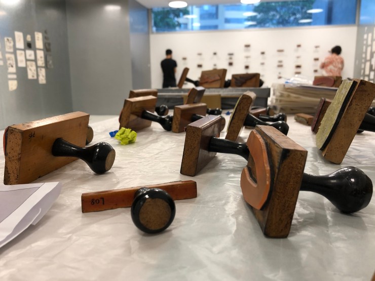 They are, in fact, the materials, indexes and signs characteristic of the artist’s living work, which come to be – yes and no (in a dialectic way) – made visible, so the visitor can access the STAMPS’ backstage world; i. e., what remained invisible or out of the scene: the repeated exhalation, the delay, the lapse, the gap, the slip, the lack, in short, the surplus and the shortness, the tempos that occur between one stamping and another – elements that, after all, (for so many in a hurry) remain unnoticed, just like the spaces that surround the letters on the paper.