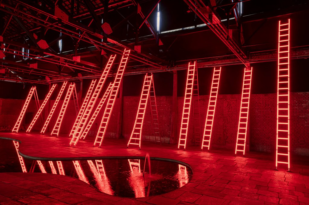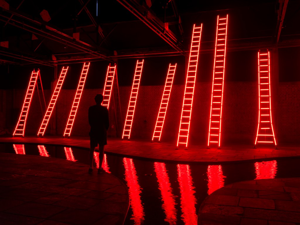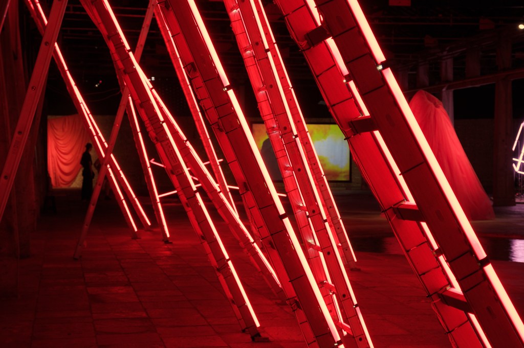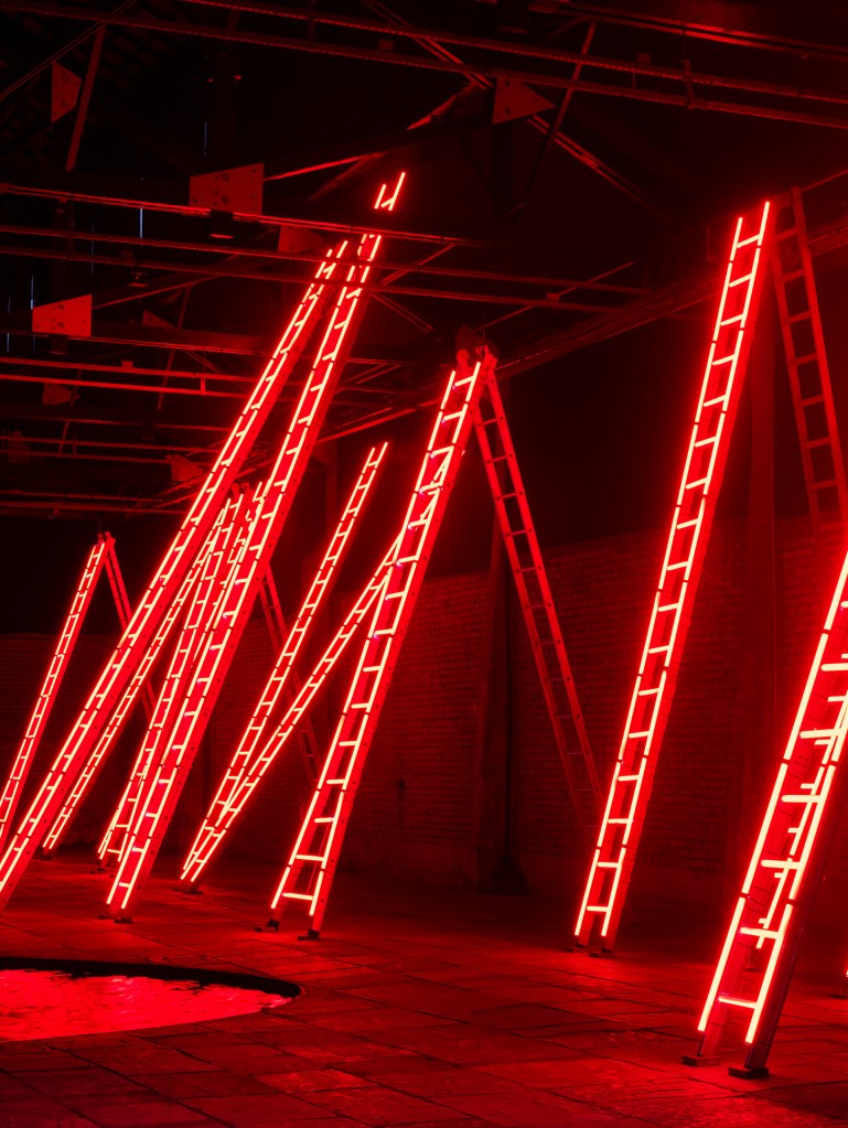 installation, Sesc Pompeia, São Paulo 13 ladders and red tubular lamps 5,50 × 21,50 × 3,70 m