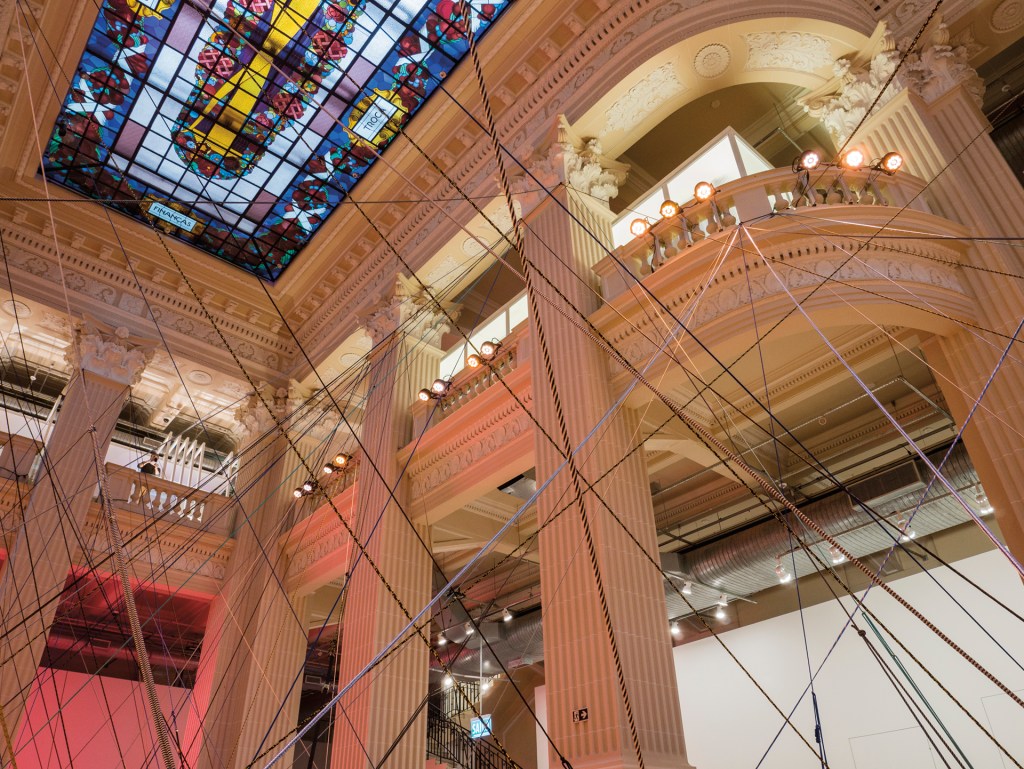 Trata-se, então, de um espaço virtual, imaginário? Uma roda gigante que entretém com sua ilusão de mobilidade, girando e girando sem sair do lugar? Alguém poderia argumentar que o edifício inteiro já havia sido construído para dar corpo a noções abstratas: o dinheiro e seus rendimentos e juros, ou o Crédito, a Economia e a Justiça (outras dentre as palavras gravadas nos seus vitrais). É possível ir mais longe e lembrar o quanto nossas cidades inteiras se converteram em uma parafernália histriônica que disputa nossa atenção, enquanto os substratos que de fato a movimentam permanecem ocultos de nossa linha de visão. Ou mesmo dizer que a totalidade da sociedade global contemporânea opera como um espetáculo de imagens e especulações em que os valores há muito perderam tangibilidade. Mas tudo isso pode ser divagação, pois, na realidade objetiva, a obra não é mais que coisas e cordas, amarras e pesos em equilíbrio – nada se move senão a errância do pensamento que se faz enquanto o corpo deambula entre as linhas oblíquas.