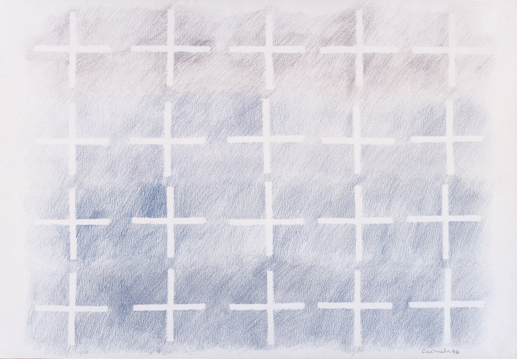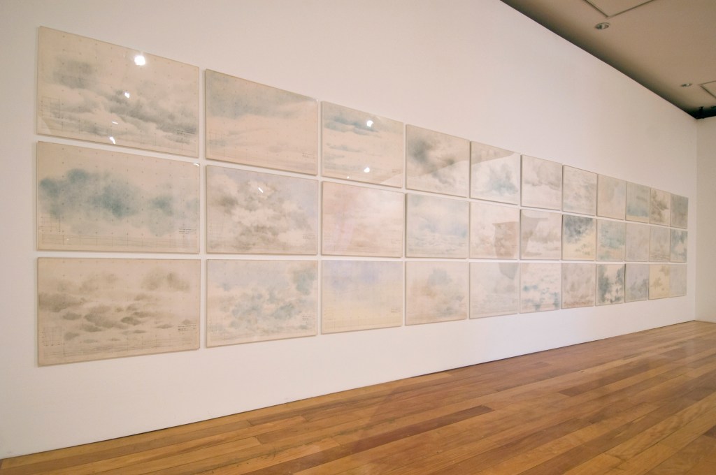 En esta serie de treinta y tres dibujos, yuxtapones la imprecisa representación de una imagen del cielo, con sus formaciones inestables de nubes y sus efímeros colores, con la racionalidad y el rigor de la cuadrícula del dibujo técnico. Una vez más, asistimos a un enfrentamiento humorístico de elementos opuestos: lo matemático frente a lo informe y transitorio. Ese énfasis en la confrontación ¿es un comentario sobre los límites de la capacidad del arte conceptual para lidiar con lo real?