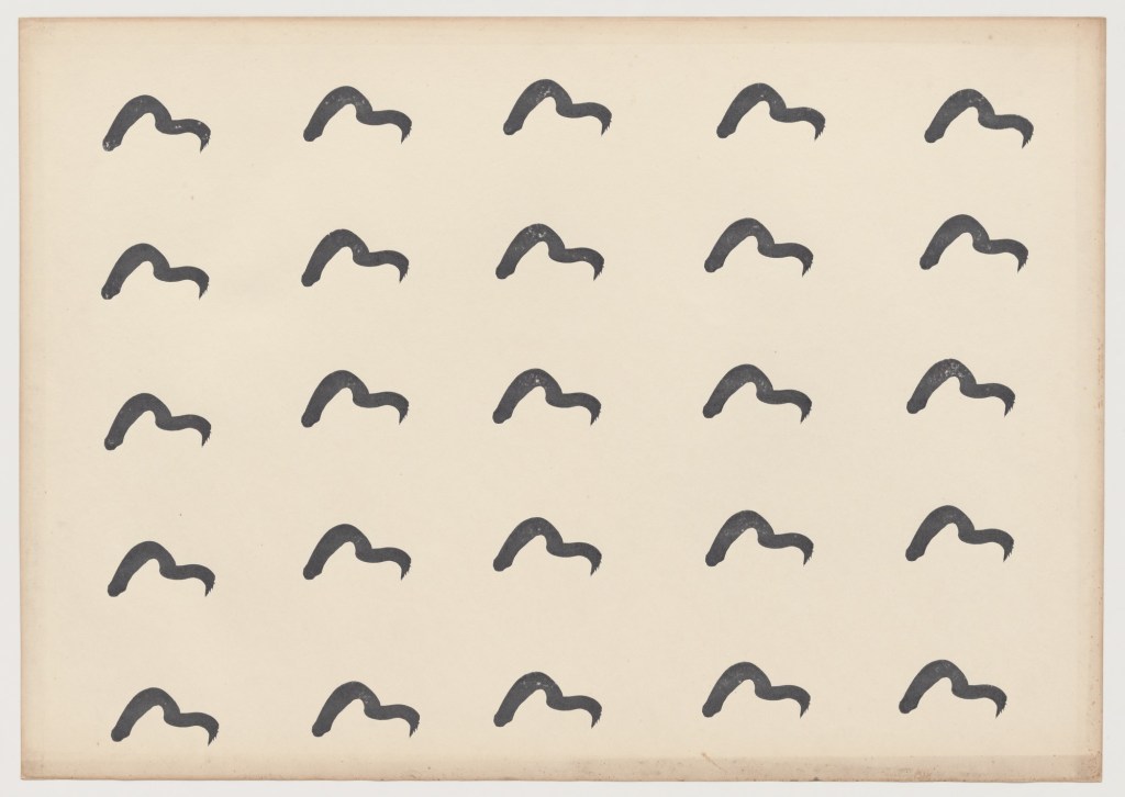 Ya desde su propio título, CARIMBOS (SELLOS) (1978), de la artista brasileña Carmela Gross, llama la atención sobre el proceso compositivo de la obra. Realizadas en tinta estampada sobre papel, cada una de las ochenta piezas de la serie muestra una marca distinta —una mancha, un garabato, una pincelada o una línea— que la artista encontró en distintas obras reproducidas en libros de historia del arte y que luego convirtió en su propio instrumento “burocrático”. Mediante un ejercicio de expresividad convertida en repetición mecánica, Gross estampó de forma sistemática los gestos particulares de otros artistas sobre la superficie de su obra.