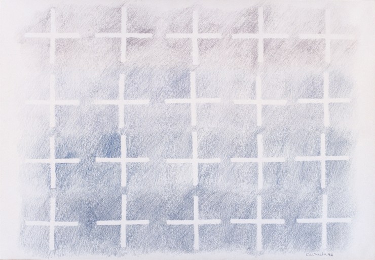 In 1979, as part of work for my master’s degree, I began a systematic investigation of drawing, examining the various modes of representation of the visible world historically called observational drawing, geometric perspective, analytic geometry, topographical drawing, architectural drawing, and so on. Although I hadn’t developed a theoretical dissertation, all this material served as a conceptual foundation for making the series of drawings called PROJETO PARA A CONSTRUÇÃO DE UM CÉU, which I presented in 1981 to obtain a of master’s title in visual poetics from the Universidade de São Paulo. I exhibited 70 × 100 cm drawings, made with colored pencil and china ink on paper. Each one contains an observational drawing, two orthogonal grids, topographical records, and schematic annotations of a sky map in 33 fragments, the sum of which chart the sky of the Southern hemisphere. As in architectural blueprints, the lower right-hand side of each one bears a numbered and signed conventional stamp. Among other, more complex configurations elaborated within the productive scope of these drawings, there was a deliberate critical effort to highlight the dialectical relationship between drawing and project.