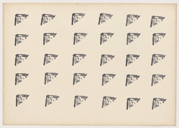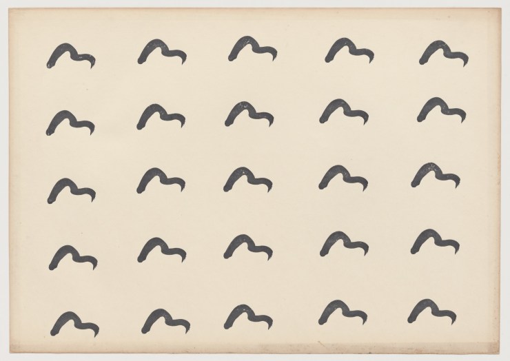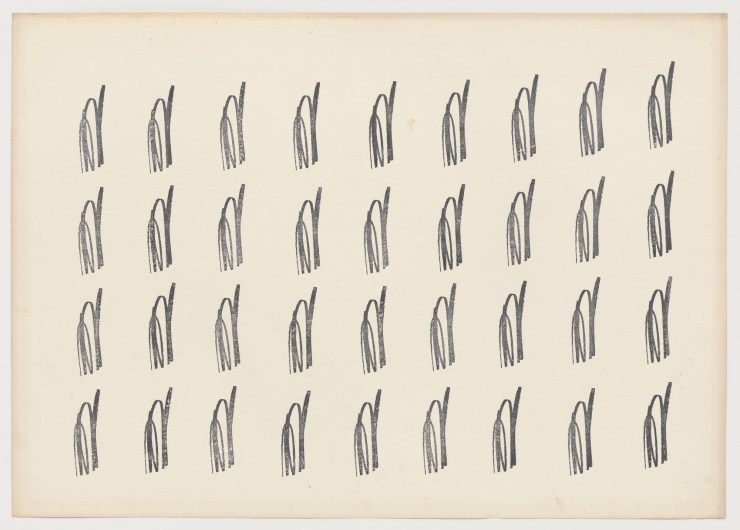 In title alone, STAMPS (CARIMBOS) (1978), by Brazilian artist Carmela Gross, calls attention to its own compositional process. Made from stamped ink on paper, each of the 80 works in the series contains a distinct mark—either a stain, a scribble, a brushstroke, or a line—that the artist found in different paintings reproduced in art history books and then transformed into her own “bureaucratic” instrument. In an exercise of gestural expression turned into mechanical repetition, Gross literally stamped, methodically, other artists’ discrete gestures across the surface.