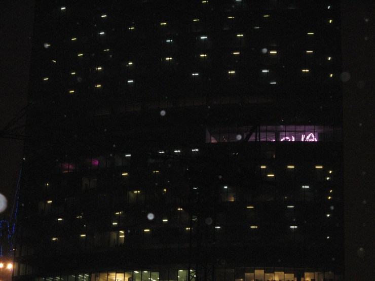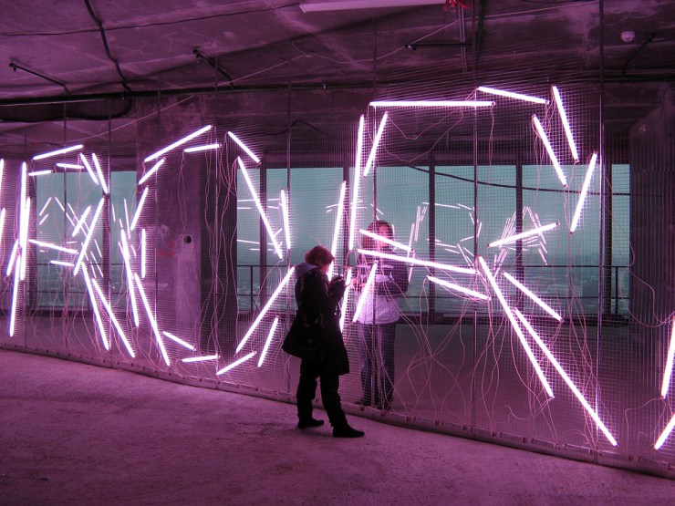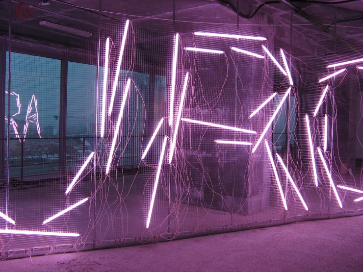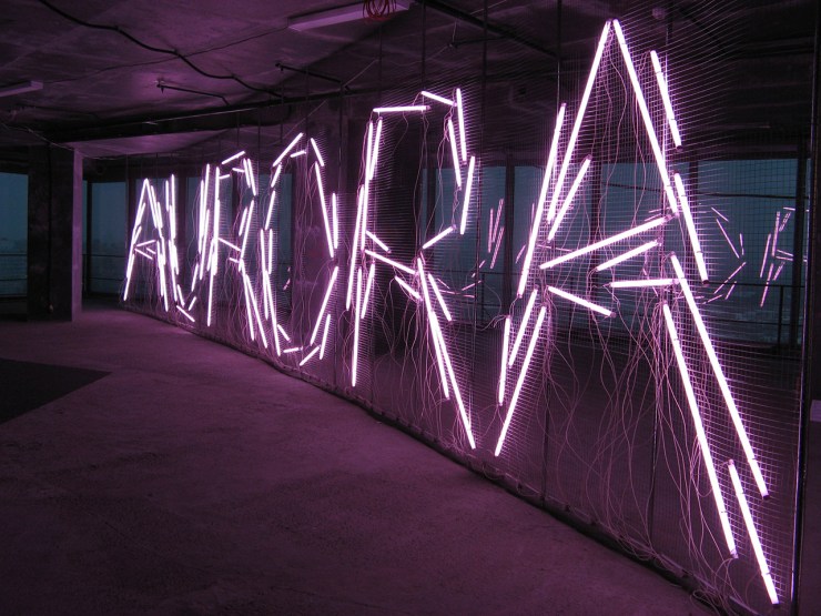 AURORA foi inscrita na parede com lâmpadas tubulares que emitem uma luz de tonalidade rosa. Sua forma incorpora aquela dos grafites de rua, daqueles que são feitos no escondido da noite, nas empenas de edifícios abandonados. Aurora é nome de mulher e é também nome de rua, da rua conhecida em São Paulo pelas suas prostitutas e pelos cines pornôs, a rua dos negócios com a carne. Aurora, como foi lembrado por alguém, evoca o nome de um navio que fez história na Rússia em 1917. Aurora é ária de uma ópera napolitana e já fez sucesso como marchinha carnavalesca no Brasil de 1941… [CG]