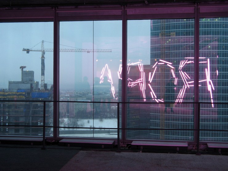 AURORA was inscribed on the wall with tubular bulbs emitting a pink-toned light. Its shape suggests that of street graffiti, of the kind done while hidden by the dark of the night, in the gables of abandoned buildings. Aurora is a woman’s name and is also the name of the street known in São Paulo for its prostitutes and porn cinemas, the street for affairs of the flesh. Aurora, as recalled by someone, evokes the name of a ship that made history in Russia in 1917. Aurora is an aria of a Neapolitan opera and was already successful as a carnival song in Brazil in 1941… [CG]