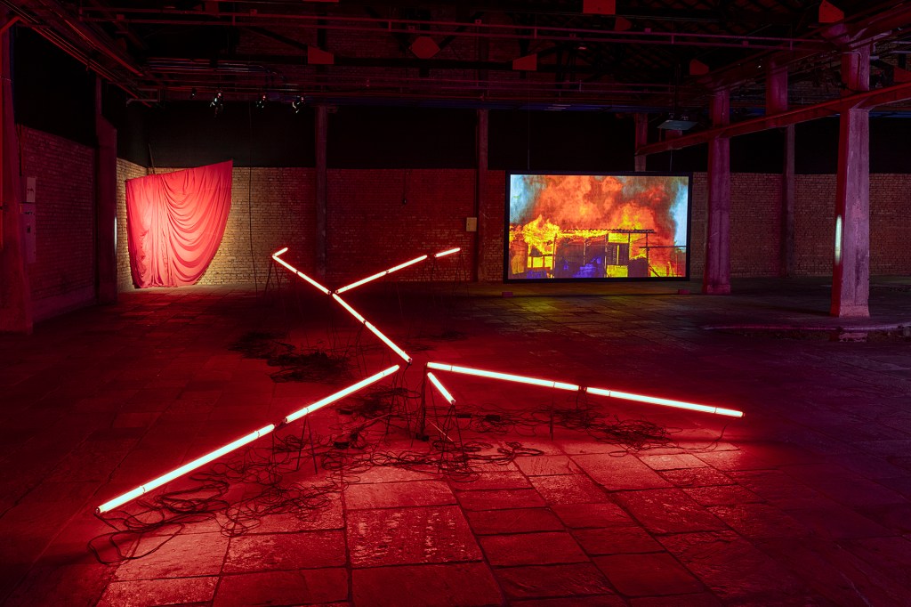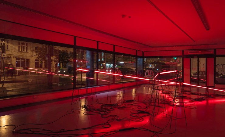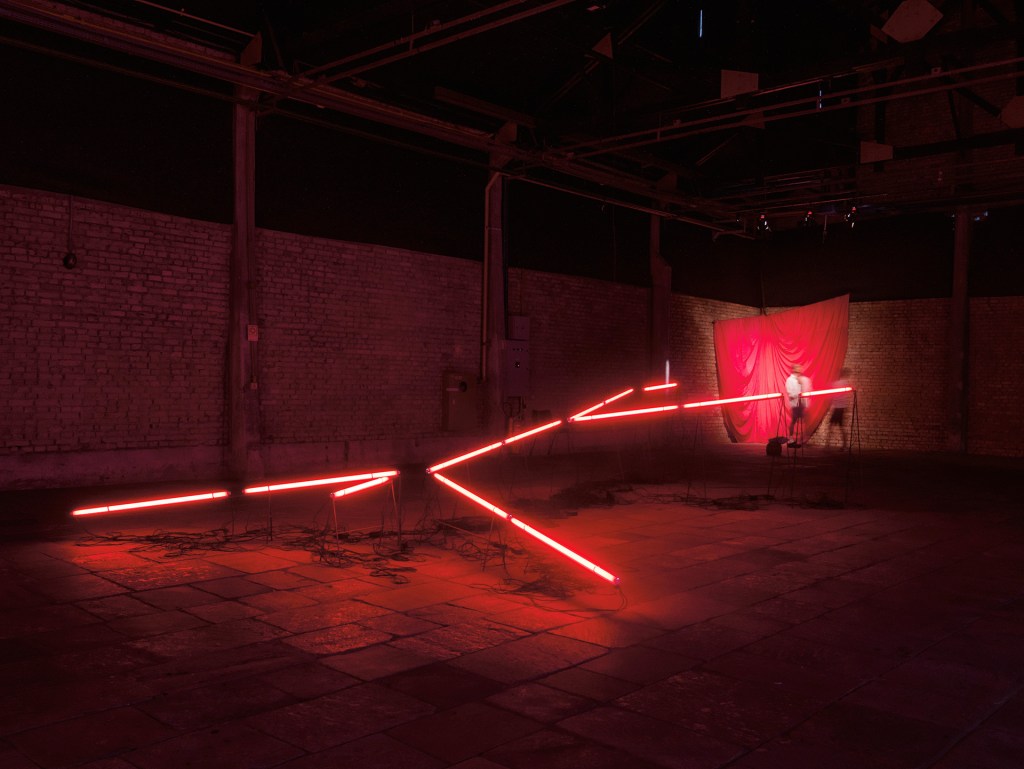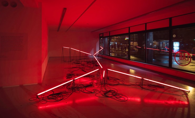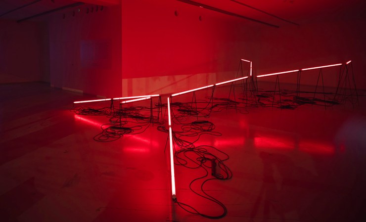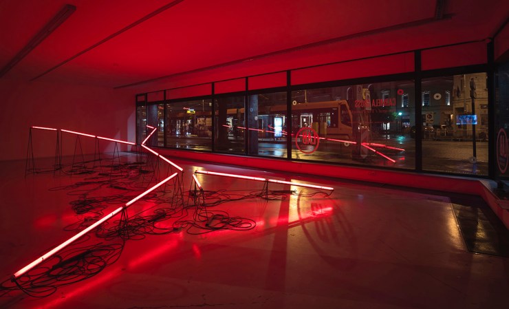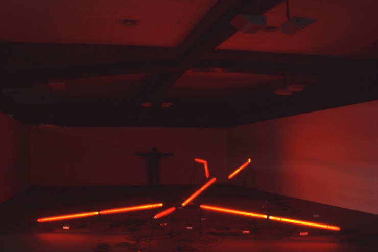 THE PHOTOGRAPHER is a light‑drawing in space which sketches the leaning figure of a man in the emptiness of the room – gigantic arms, legs, feet, trunk and head, distended and in pieces. Its luminous lines are made of red fluorescent bulbs affixed on very thin metal trestles; these are adjusted, composed and distributed throughout the room; on the floor are scattered many meters of tangled wires connected to reactors, sockets and switches. The figure thus drawn recalls the primitive representations of man in ancient cultures or even those of schematic children’s drawings, synthesized in segmented lines which demarcate the body by a direct line, without volume or thickness: a sign. Now it happens that this sign is electrified, it is a light-sign… and although it is installed in a small room, it is huge and overflowing… it absorbs the energy of the great city and expands in it… it is inscribed as body and line, like incandescent matter and drawing… just like an urban sign.[CG]