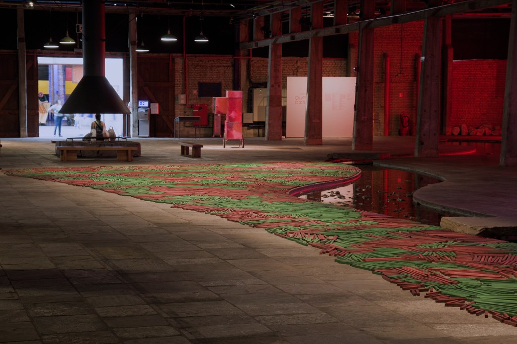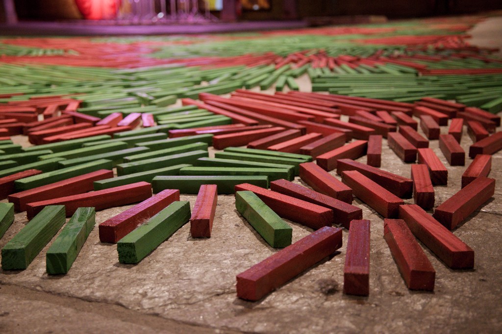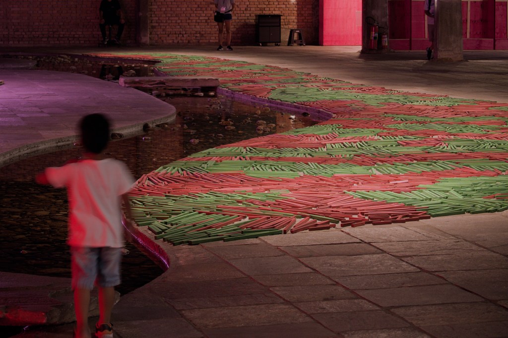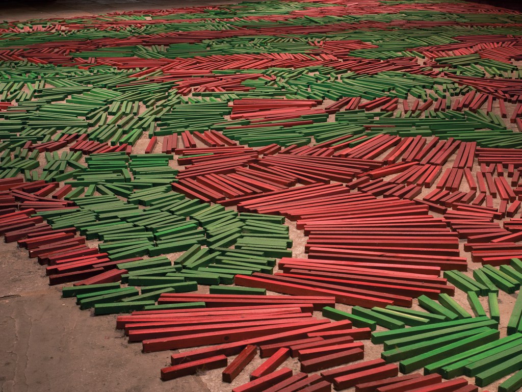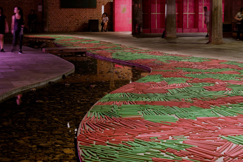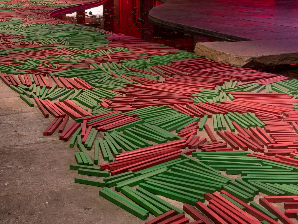 MADEIRA RIVER was first exhibited in 1990 at Sesc Pompeia, in the exhibition Gente de fibra. It is composed of wooden slats arranged directly on the floor. Many are painted green; others, red. The way they are positioned — in different directions, with varied rhythms, closer together or farther apart — creates a vibrant mass along the edges of the reflecting pool. The juxtaposed slats can be seen as a kind of enlarged scribble: a graphic drawing traced on the ground. Even with a different materiality, they respond to the movement of the water, perhaps evoking a rushing current. [CG]