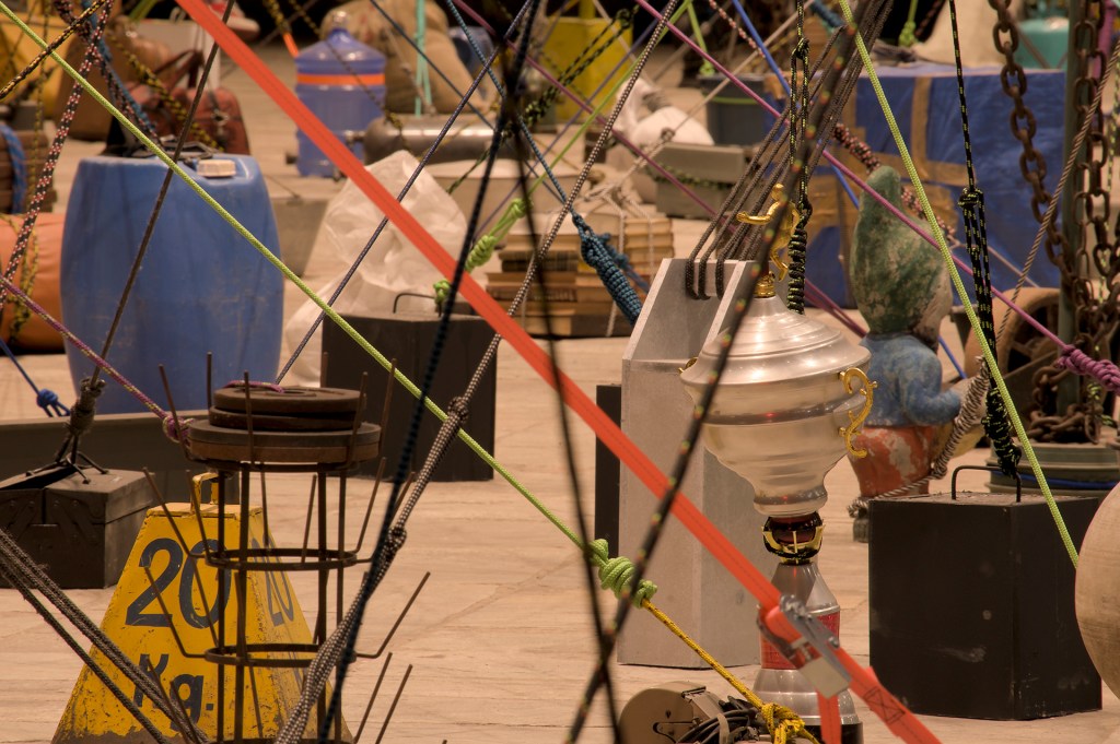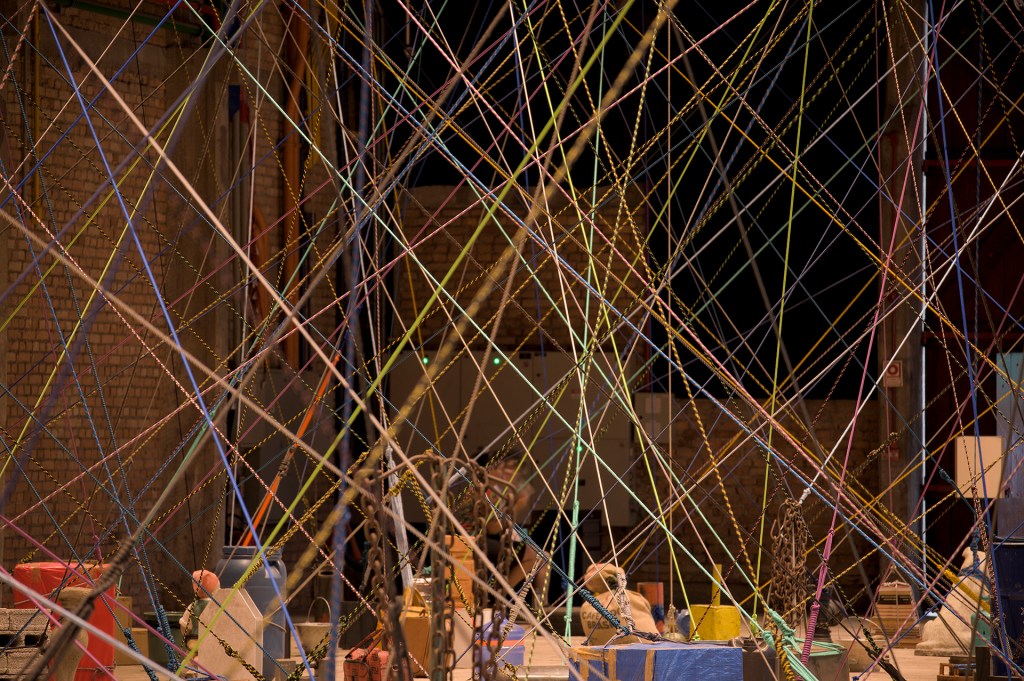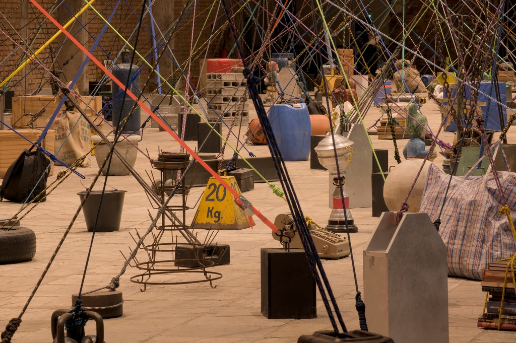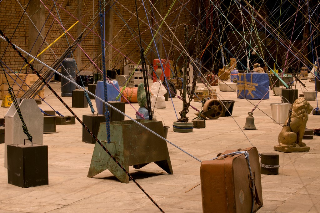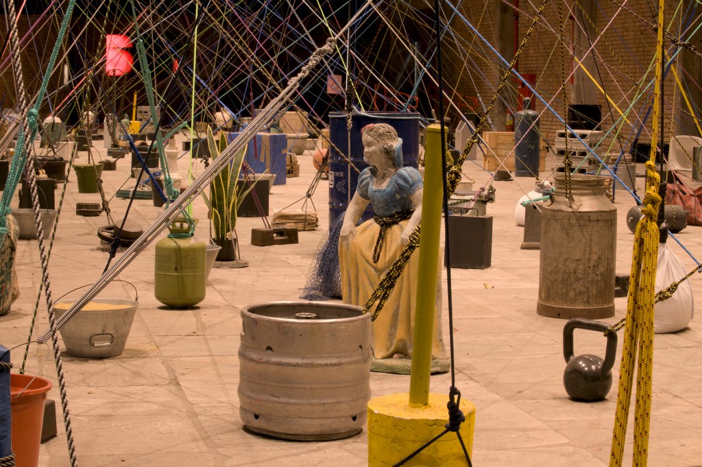 BIG WHEEL is an installation composed of approximately 320 objects arranged on the floor. Each object is tied with ropes to the beams of the warehouse roof. In this way, the entire space becomes permeated by ropes crisscrossing in various directions, visually creating a kind of irregular web made of many colors and varying thicknesses. The chosen objects are disused or obsolete… recognizable as fragments — raw, undefined in color, rustic, fake, everyday utensils for undervalued labor: buckets, drums, bundles, mechanical parts, counterweights… in short, a monstrous collection of commodities. [CG]